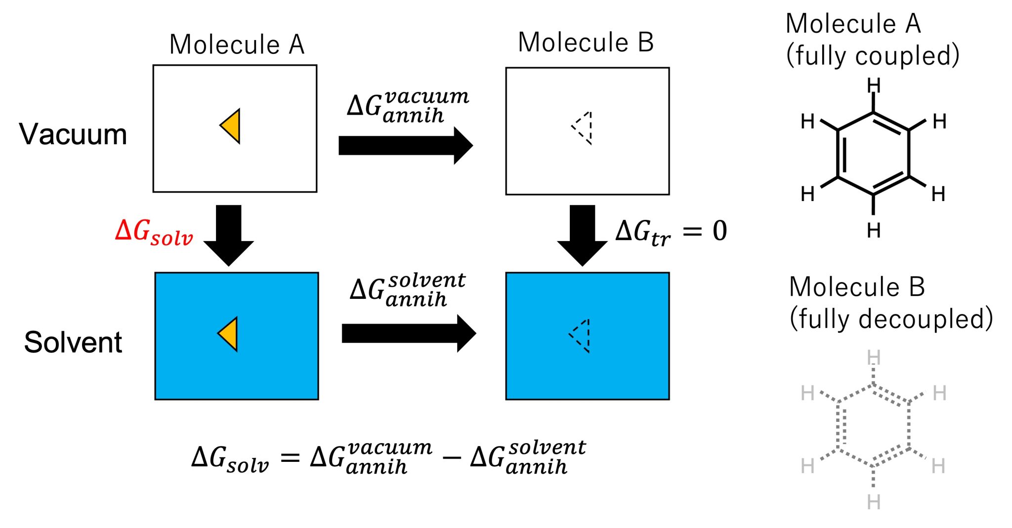 where \(\Delta G_{\rm tr}\) is the change in the free energy of translational and rotational motion of the solute. In the fully decoupled state (molecule B), the solute can move freely in the simulation box both in vacuum and in solvent, resulting in \(\Delta G_{\rm tr}=0\). In this tutorial, we will demonstrate how to calculate \(\Delta G_{\rm annih}^{\rm vacuum}\) and \(\Delta G_{\rm annih}^{\rm solvent}\) using the FEP functions in GENESIS.