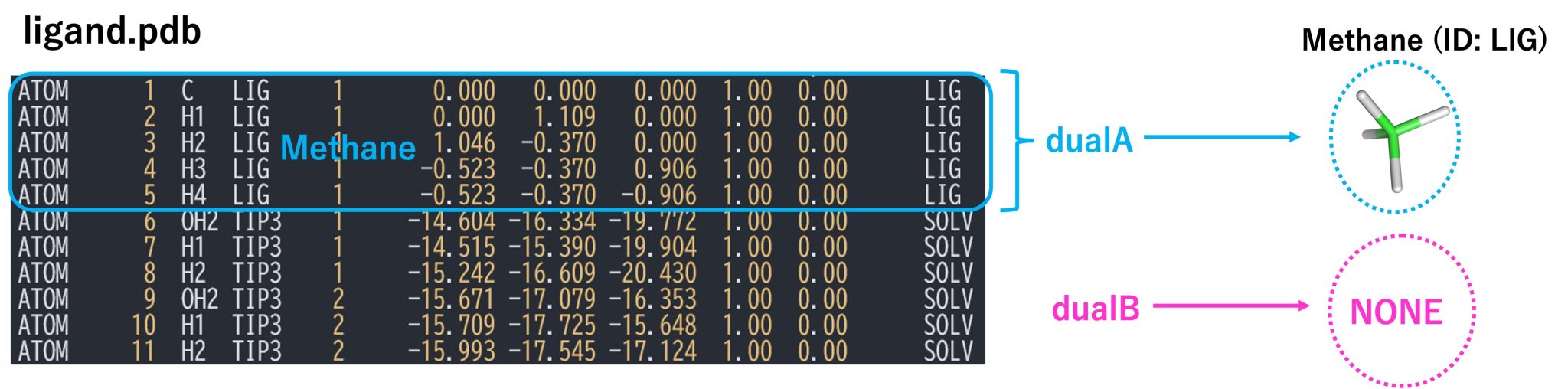Figure 2. PDB file for the dual topology and definitions of dualA, and dualB.