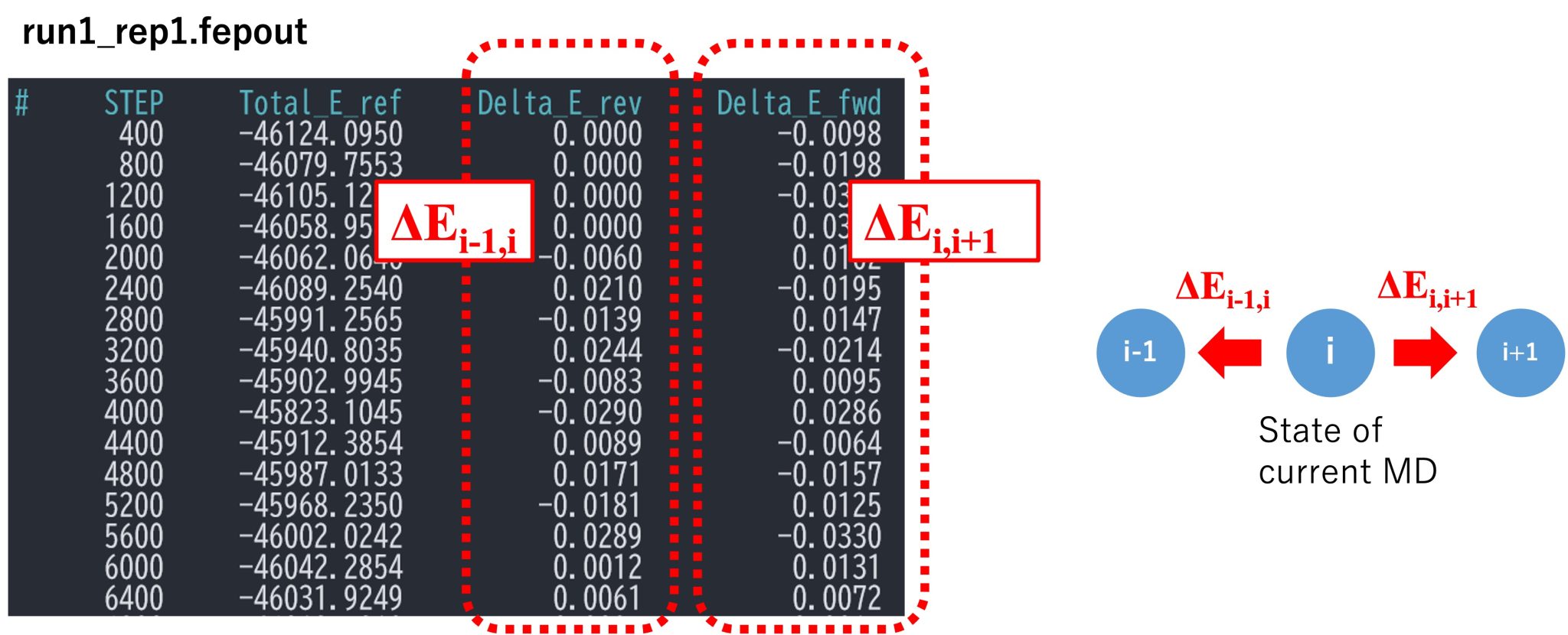 In this step, we perform the production run of FEP/REMD simulations. We prepare 24 replicas: The first and the last replicas correspond to the initial and final states, respectively, while the other 22 replicas correspond to intermediate states. 24 replicas run in parallel and exchange their parameters at fixed intervals during the simulation. Exchanges between adjacent replicas are accepted or rejected according to the Metropolis criterion 1,2.