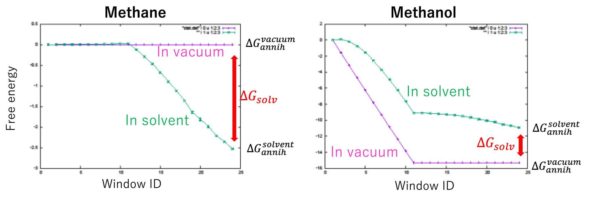 Figure 6 shows the free-energy changes of methane and methanol. The free-energy changes in window ID 24 for “in solvent” and “in vacuum” correspond to \(\Delta G_{\rm annih}^{\rm solvent}\) and \(\Delta G_{\rm annih}^{\rm vacuum}\), respectively.